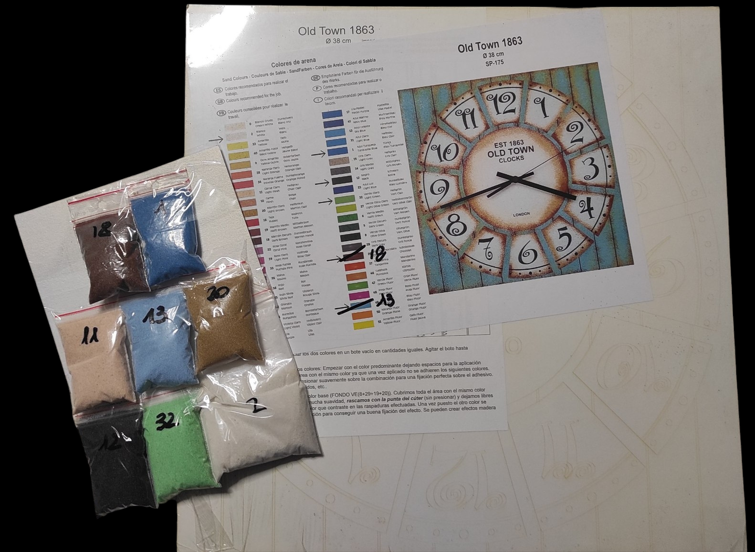 Kit costituito da base in legno di cm 38 c.ca di lato e disegno pretagliato del soggetto, un disegno in bianco e nero con tracciato numerato dei colori da utilizzare, un set dei colori per il riempimento degli spazi.