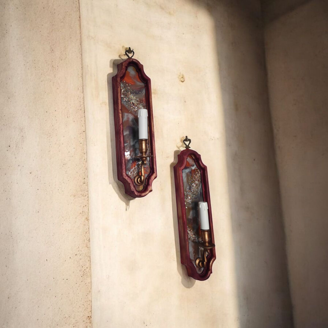 Con il loro stile simil-gotico ma nelle tonalità del bordeaux/arancio/rame e la luce calda che emanano, queste appliques creano un'atmosfera incantevole e accogliente.
