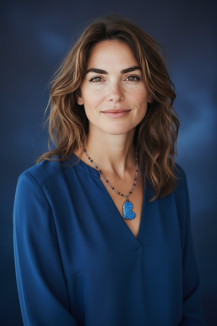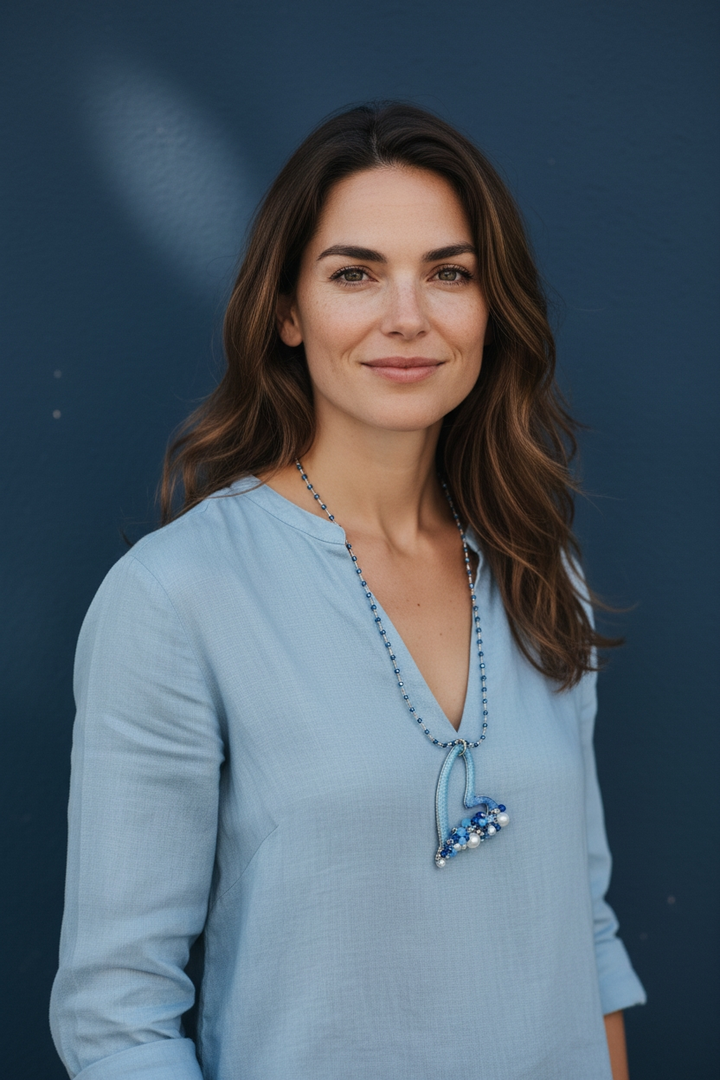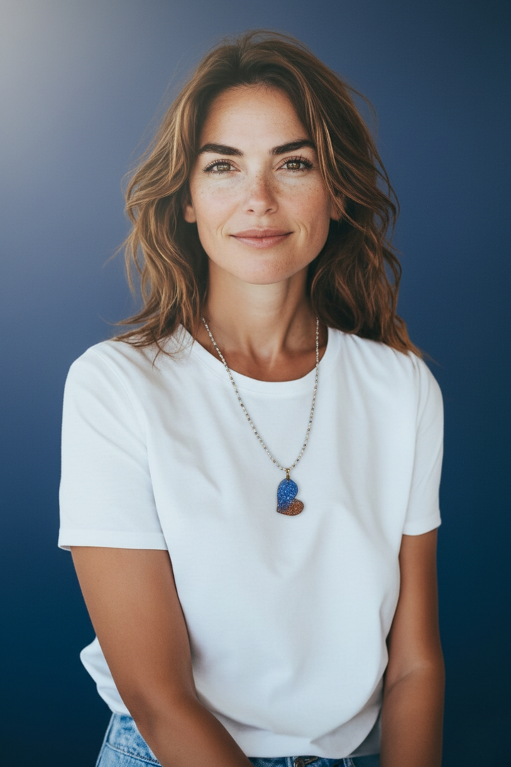 Bellissimo cuore sparkly di c.ca cm 9,5x6,5 montato come pendente su una collana dorata con cristalli blu lunga cm 70. Il lato corto del cuore é stato arricchito con un intreccio di cristalli e perle che gli conferiscono un'eleganza e un tocco magico notevoli.