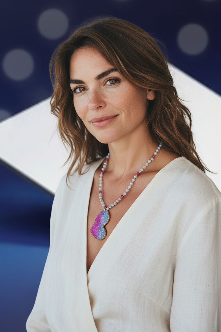 Collana cuore pieno sfumato dall'azzurro al fucsia, con contorno in oro.