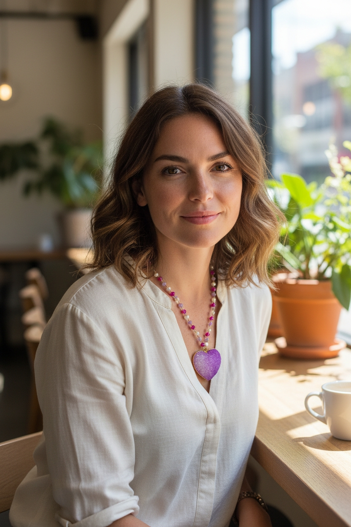 Cuore sparkly molto luminoso di colore lilla con catena lavorazione crochet a rosario, con cristalli viola iridescenti. Il lato lungo é stato arricchito con un intreccio di cristalli e perle che gli conferiscono un'eleganza e un tocco magico notevoli.
