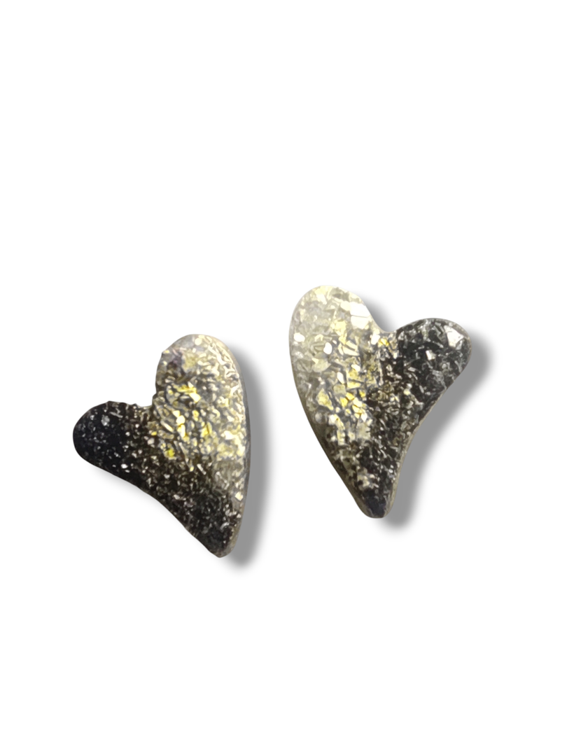 Orecchini con monachella e bordature in color oro realizzati in resina con effetto diamantato di colore bianco. Bordo del cuoricino dorato.