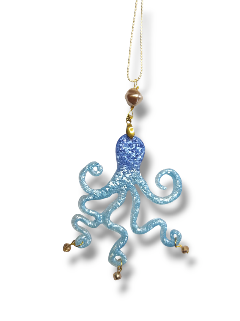 Pendente in resina lavorazione diamantata con soggetto un polpo nei colori sfumati dall'azzurro al blu. Piccoli cristalli dorati appesi ai tentacoli, una perla dorata a cui é unita la catena