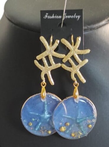 Tondi in resina con stella marina blu e piccoli soggetti dorati