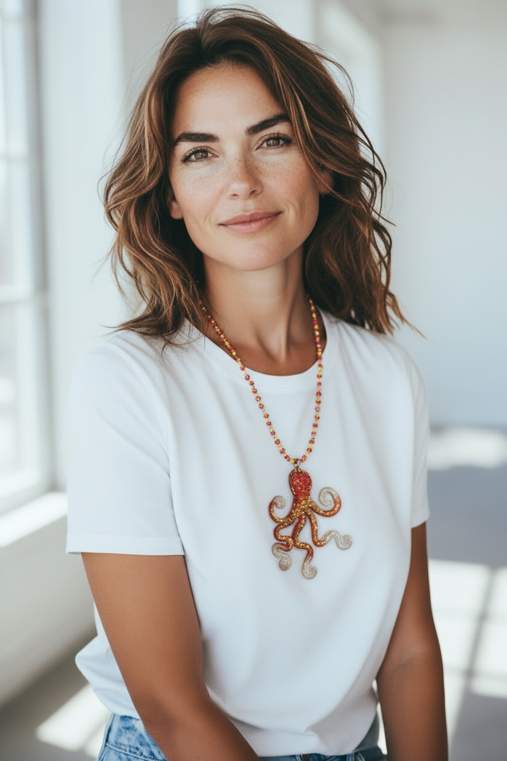 Pendente in resina lavorazione diamantata con soggetto un polpo nei colori sfumati dall'azzurro all'aragosta. Piccoli cristalli dorati appesi ai tentacoli, una anello lavorato a crochet nei toni dell'aragosta