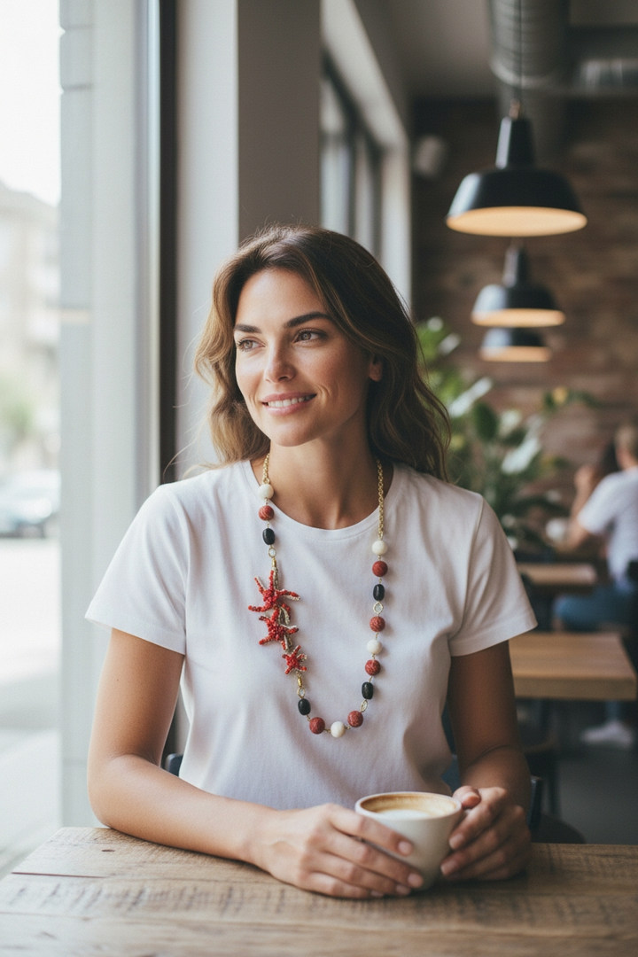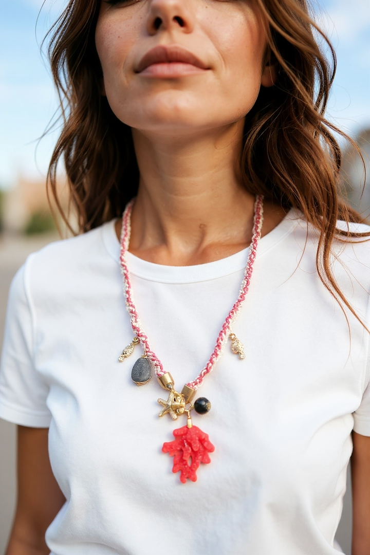 Molto particolare la lavorazione di questa collana lunga: su una catena realizzata con filato rosso e catena a palline, é stato inserito un pendente in resina 3D in un rosso acceso, in contrasto con le pietre laviche nere e i pendentini con soggetti marini che si snodano lungo la catena stessa.