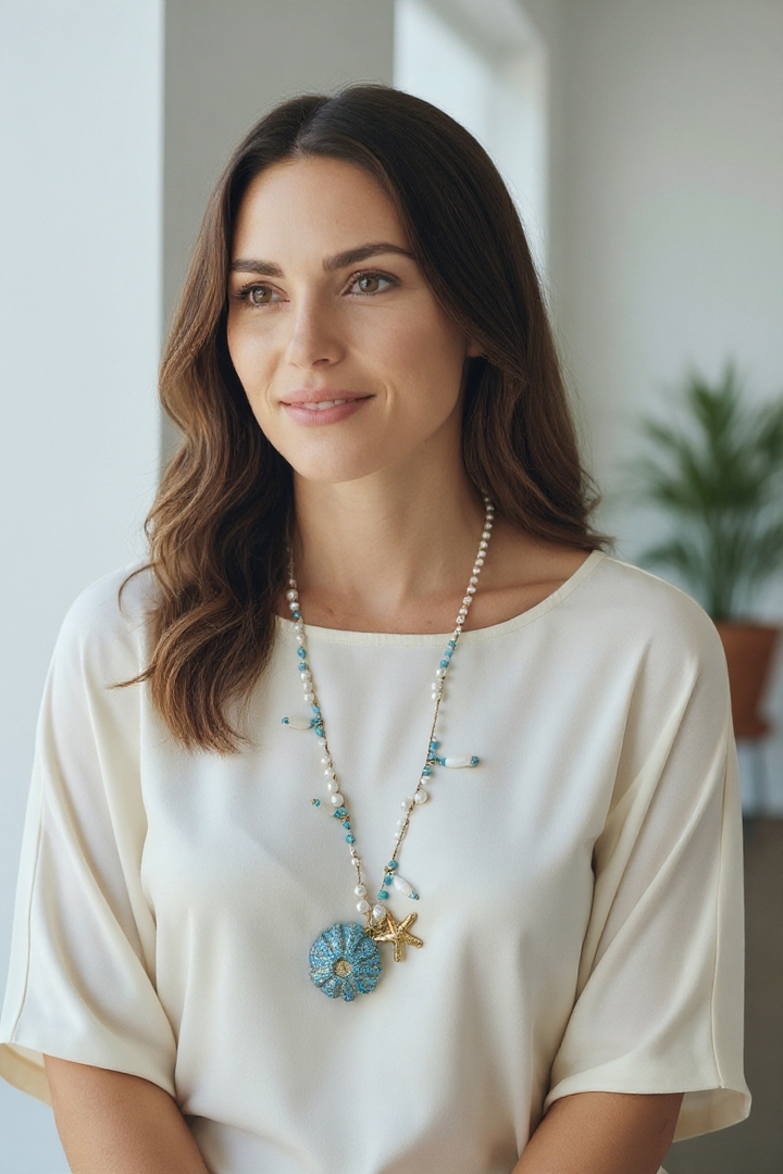 Bellissima ed estivissima questa collana lunga che vede alternarsi perle di fiume tonde a cristalli turchesi, pesciolini in ceramica e un bellissimo centrale in resina con riproduzione di un riccio di mare.