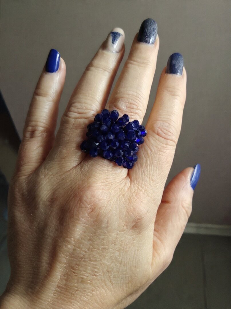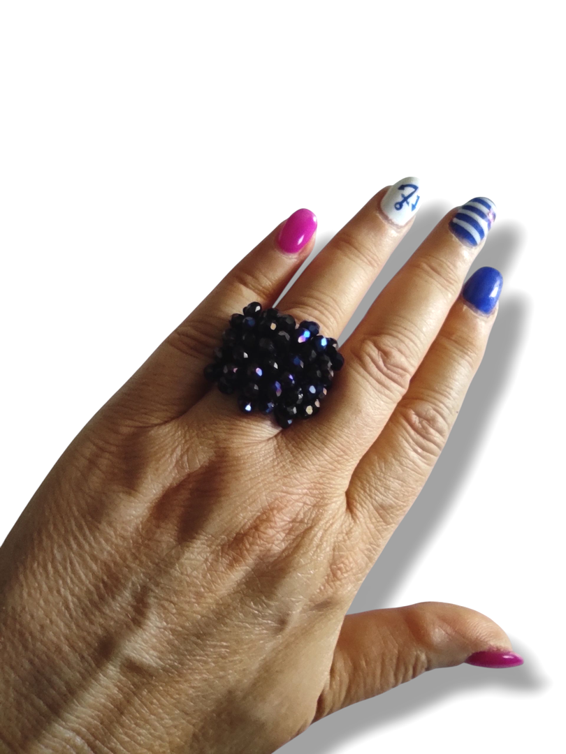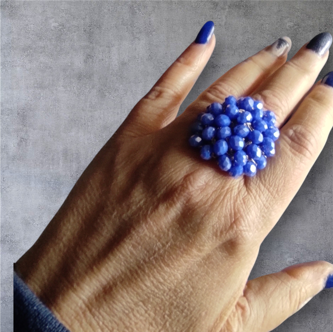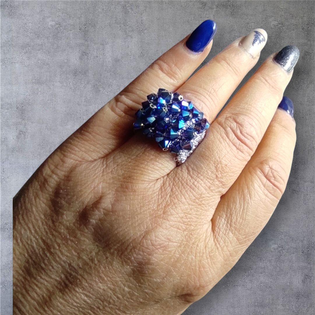 Anello a fascia in filato metallizzato blu scuro, con lavorazione a crochet e cristalli blu sfaccettati per un effetto luminoso e ricco.
