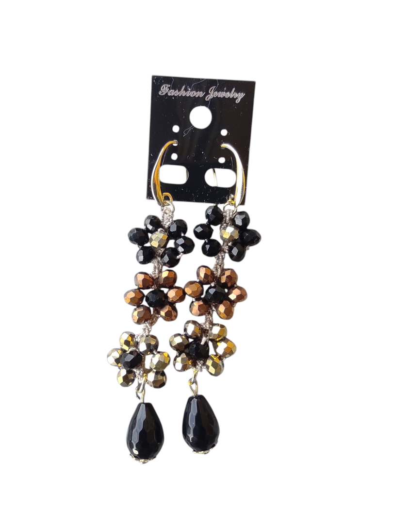 Tris di fiorellini in cristallo nero, bronzo e oro con pendente a goccia nero.