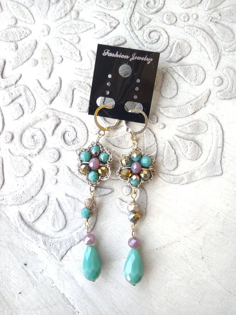Tris di fiorellini in cristallo verde/turchese con pendente a goccia turchese.