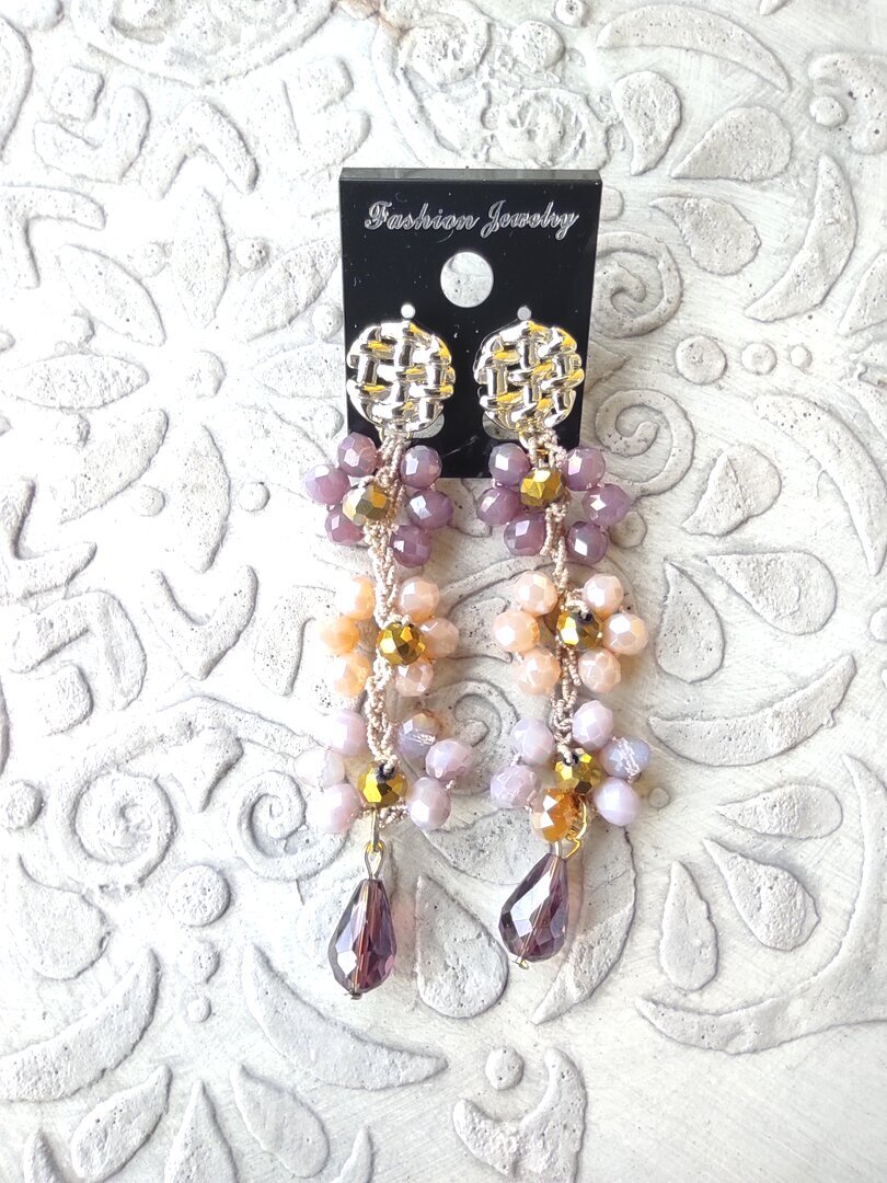 Realizzati con filato metallico dorato e cristalli in tonalità di rosa, malva e rosa trasparente, questi orecchini crochet ti faranno brillare in ogni occasione.