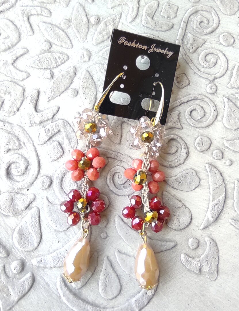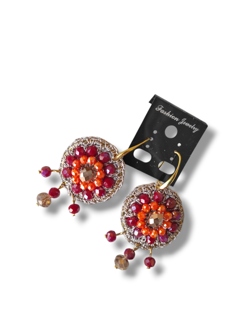 Orecchini realizzati in filato oro metallizzato e cristalli rosso, arancio e oro