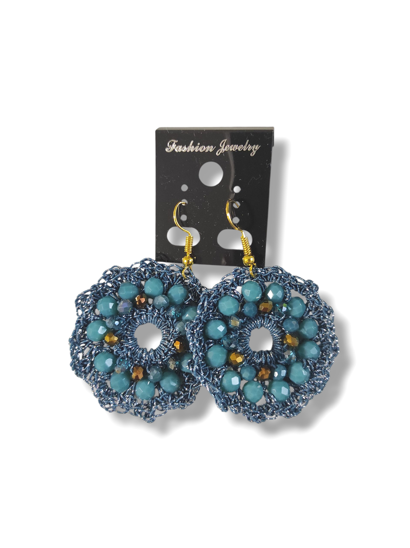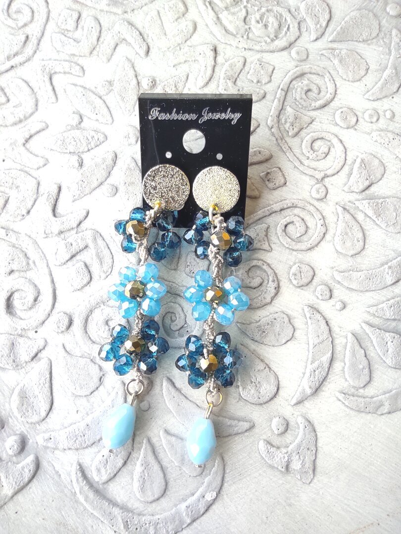 Realizzati con filato metallico dorato e cristalli in tonalità di blu/azzurro/oro, questi orecchini crochet ti faranno brillare in ogni occasione.