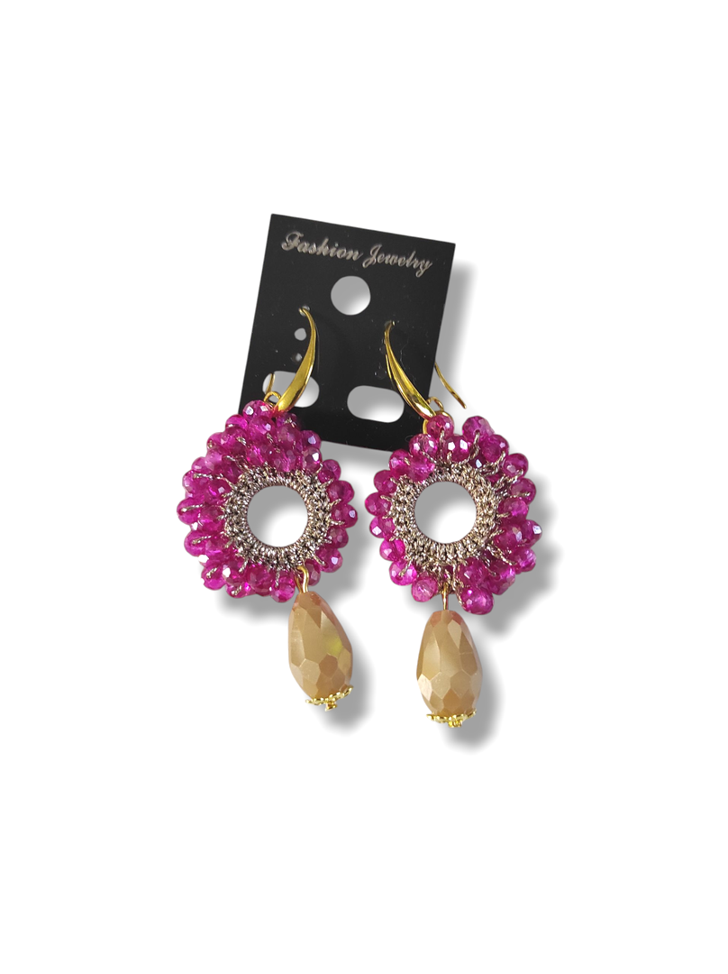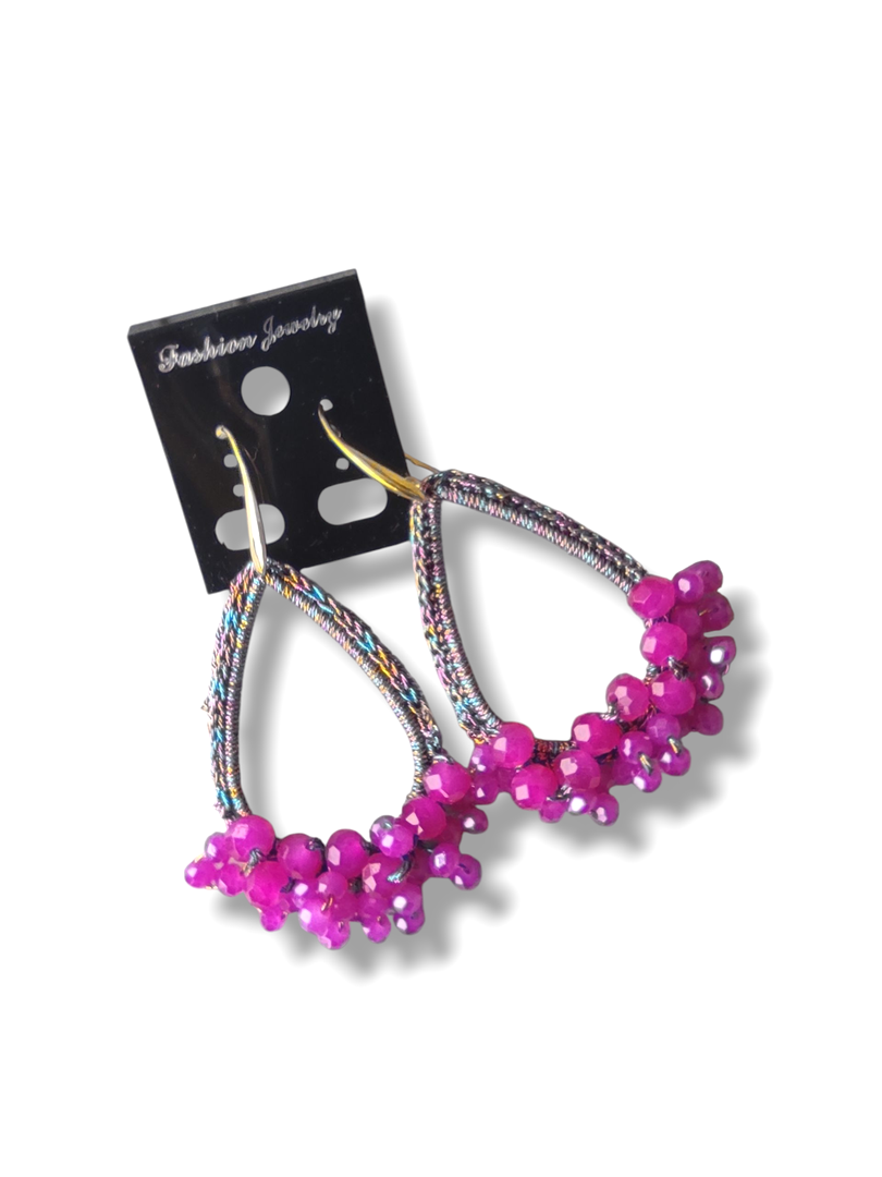 Orecchini a goccia realizzati in filato multicolor metallizzato e cristalli fucsia.