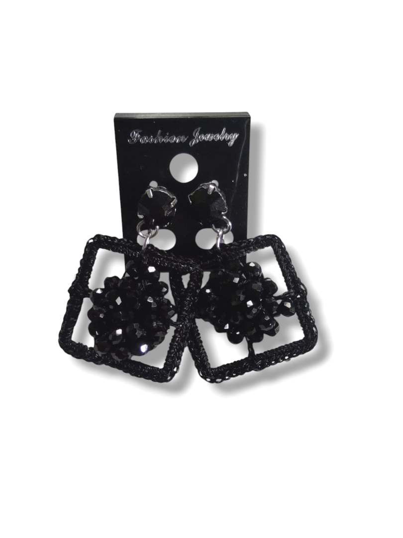 Particolare orecchino quadrato con filato e centrale grappolo di cristalli neri AB.