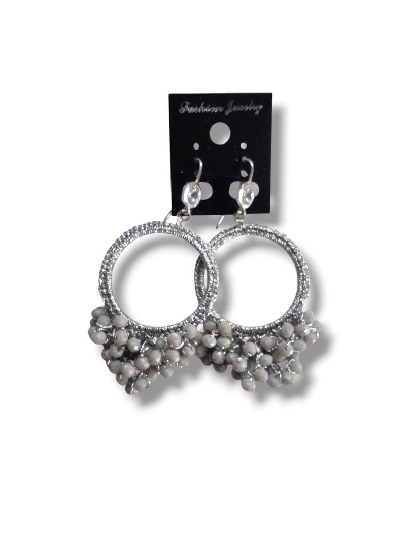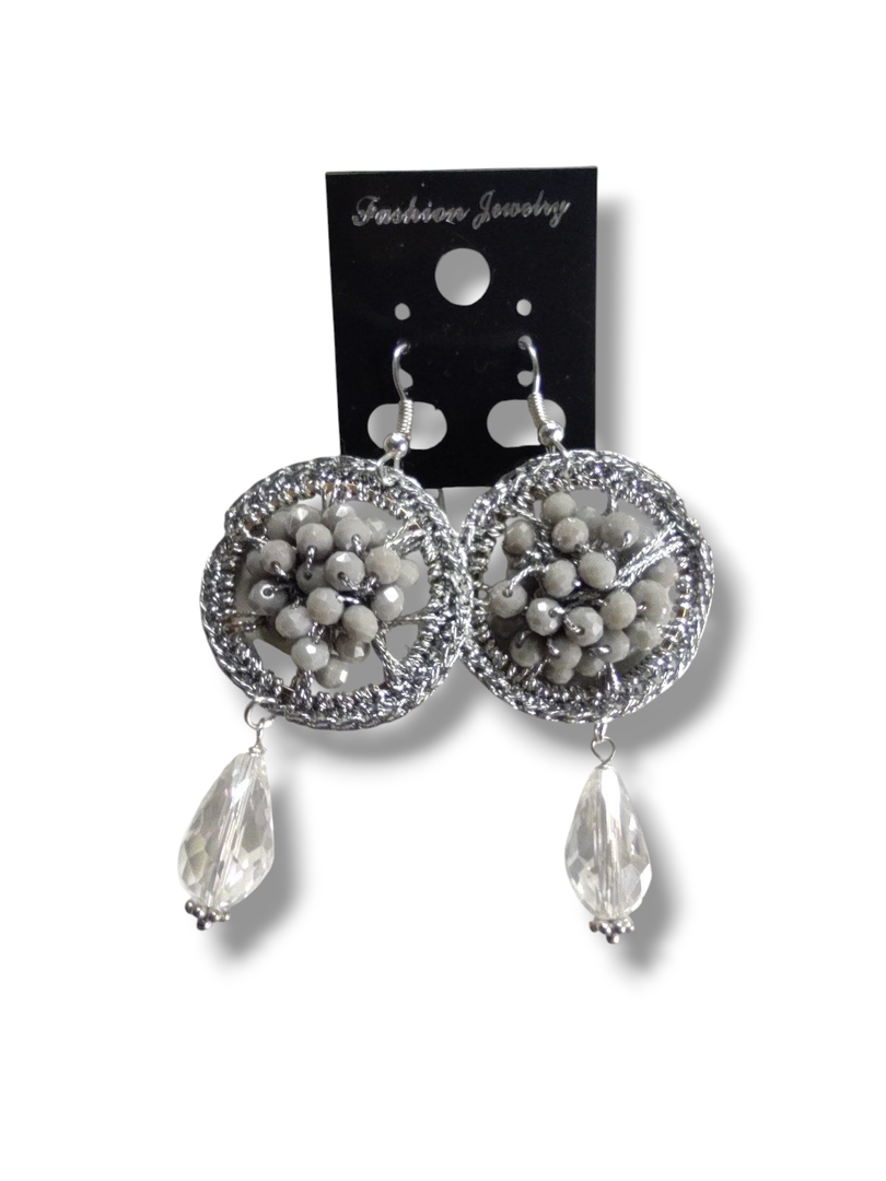 orecchini leggerissimi dalla forma tonda con "grappolo" di cristalli grigi su filato metallico argento.