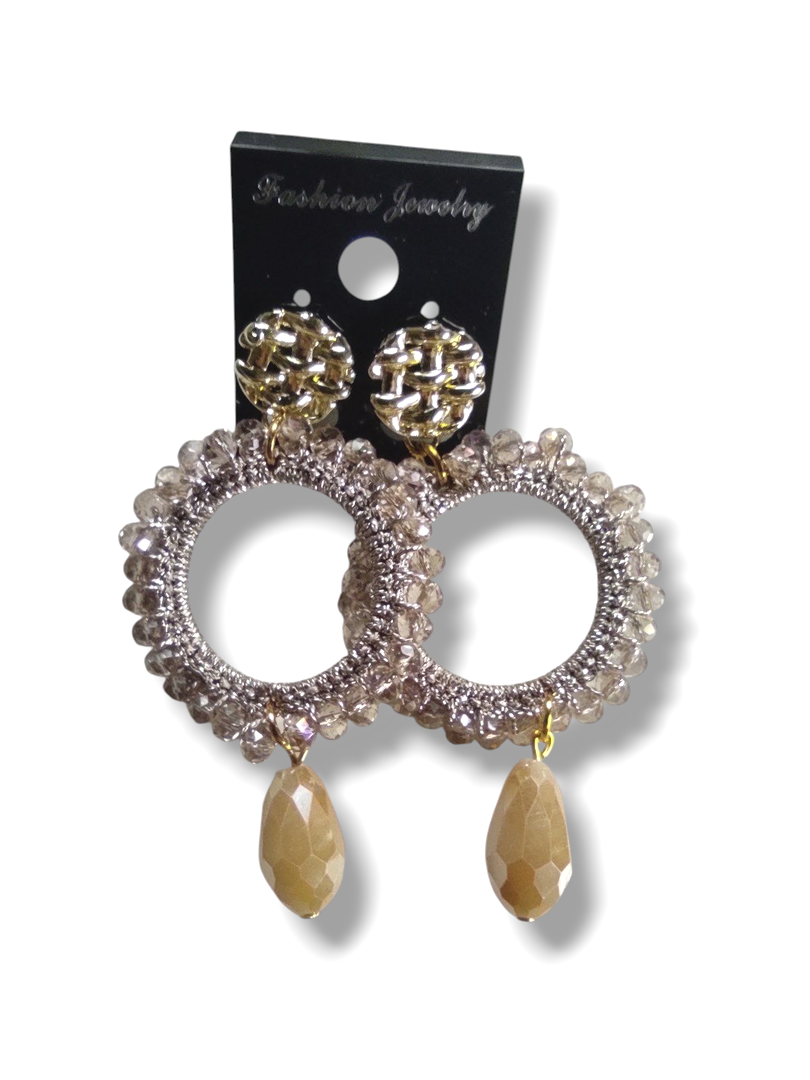 Un giro di cristalli rosa trasparente su un cerchio di cm 3,5 c.ca con pendente goccia sfaccettata beige.