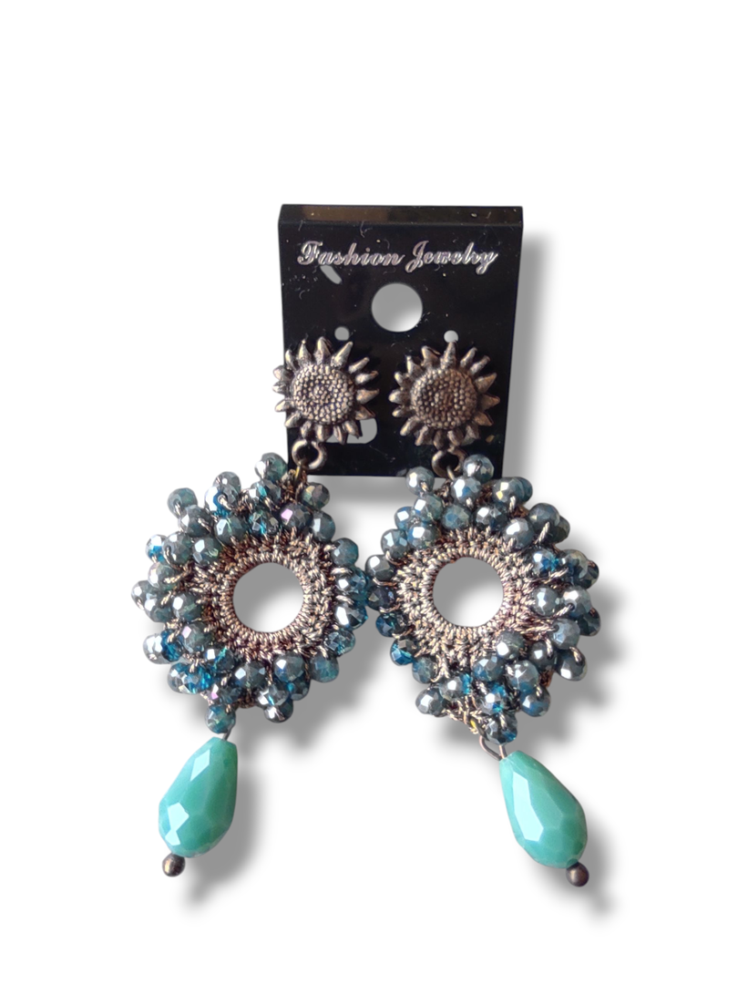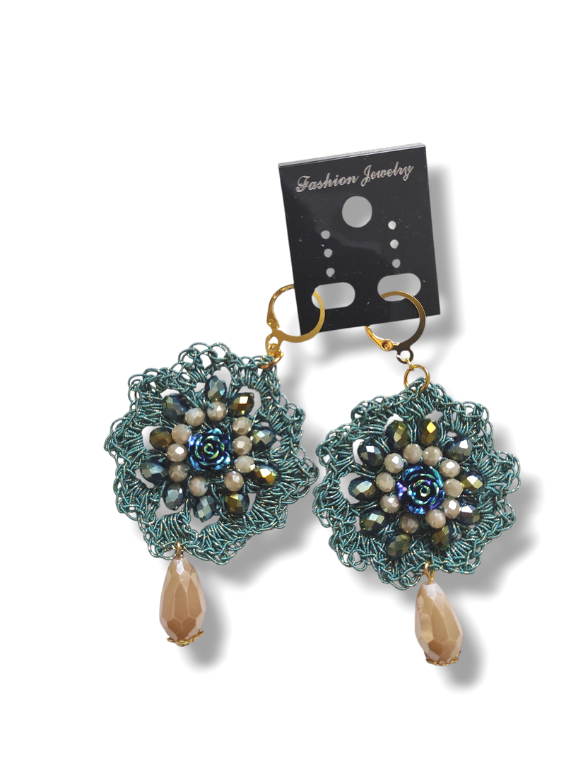 Orecchini lavorazione a crochet realizzati in filato metallizzato e cristalli verde petrolio e bronzo.