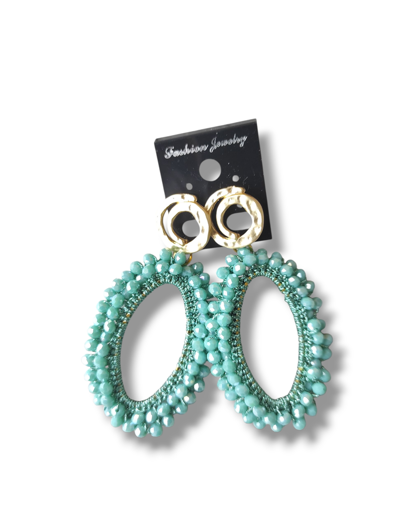Orecchini realizzati in filato verde metallizzato e cristalli beige e verde cangiante.