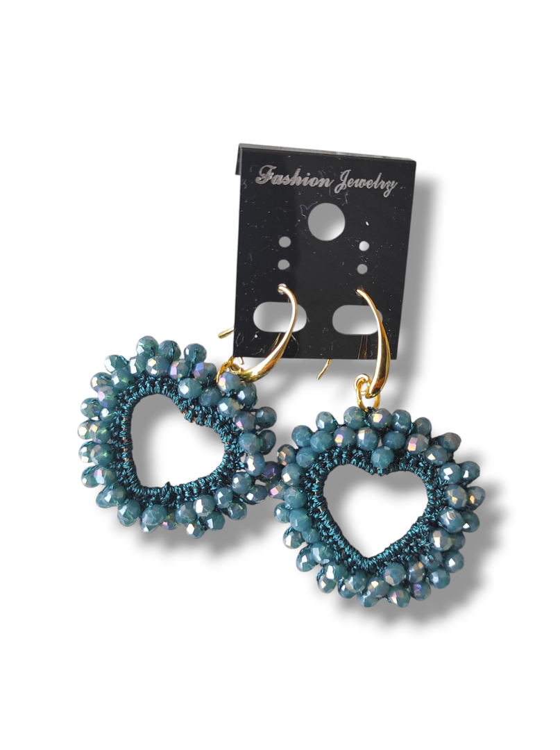 Forma a cuore per questo orecchino stiloso realizzato con filato e cristalli in verde ottanio.