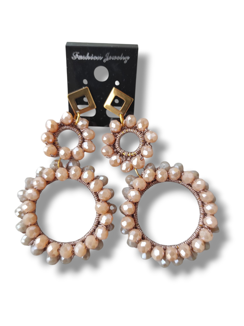 Orecchini importanti montati su filo color rame metallizzato con cerchio inferiore con doppio giro di cristalli, tortora e rosato, e cerchio superiore in rosato.