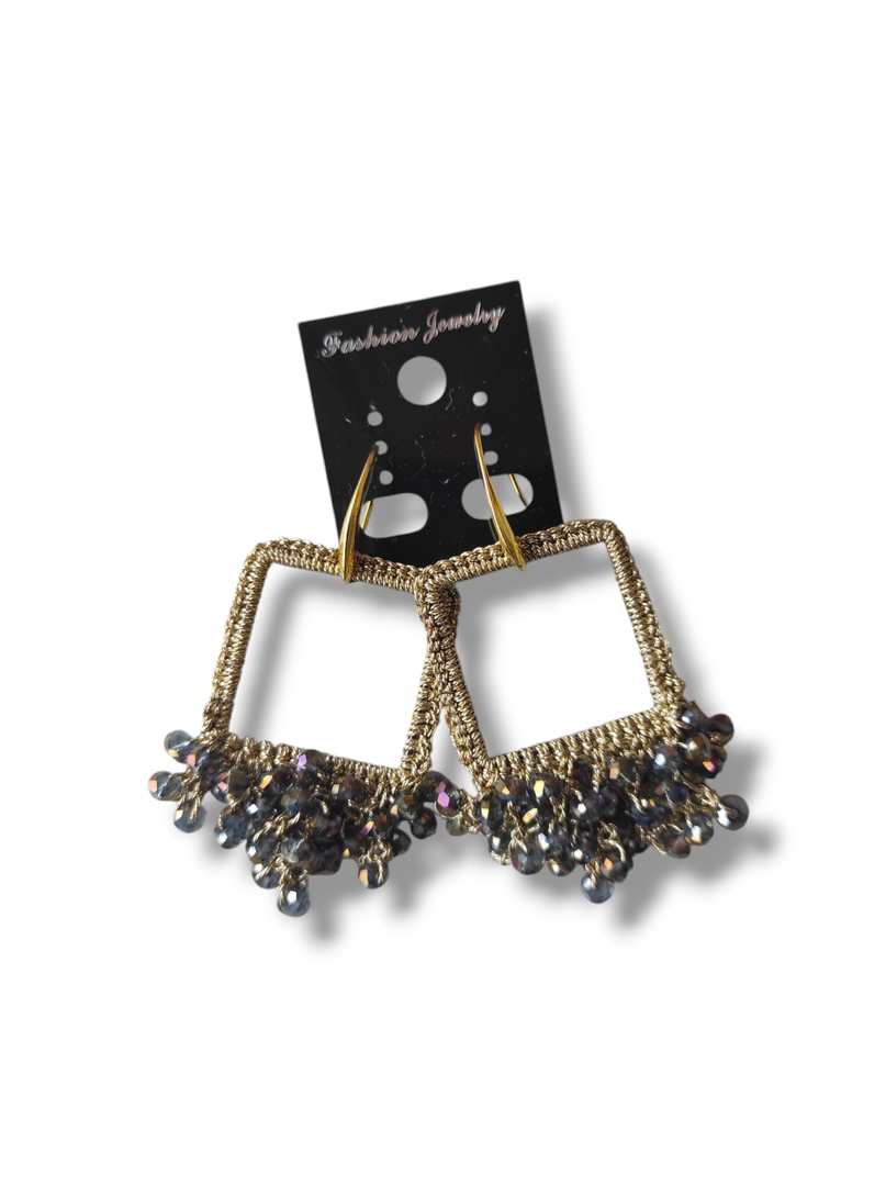 Una proposta ultra moderna questi orecchini quadrati con "grappolo" di cristalli grigio cangiante su filato misto metallico dorato.