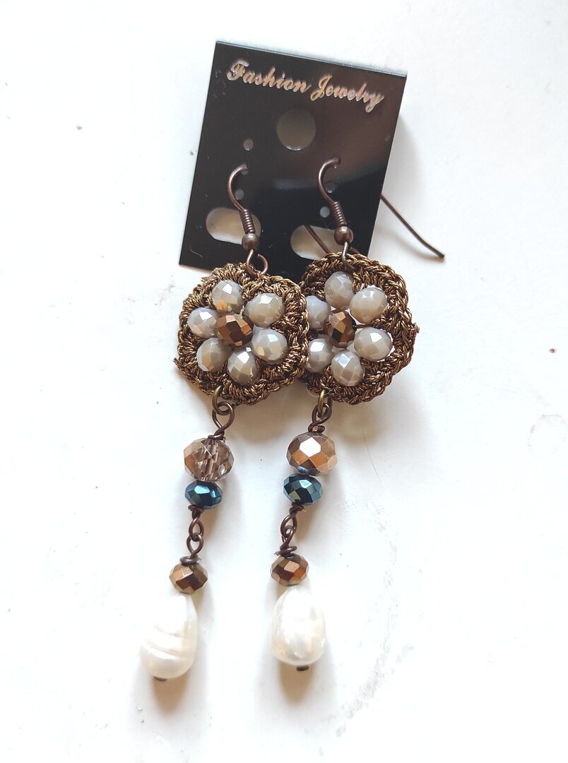 Molto delicato questo orecchino con fiorellino beige e bronzo, lavorazione a crochet.