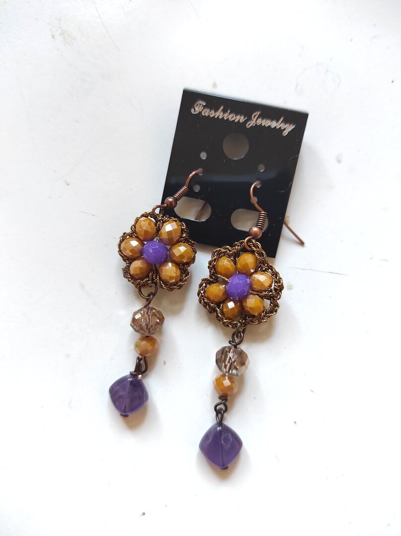 Molto delicato questo orecchino con fiorellino senape e viola lavorazione a crochet.