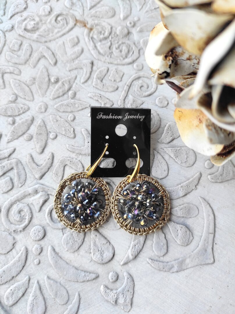 orecchini dalla forma tonda con centrale di cristalli grigi cangianti su filato metallico dorato.
