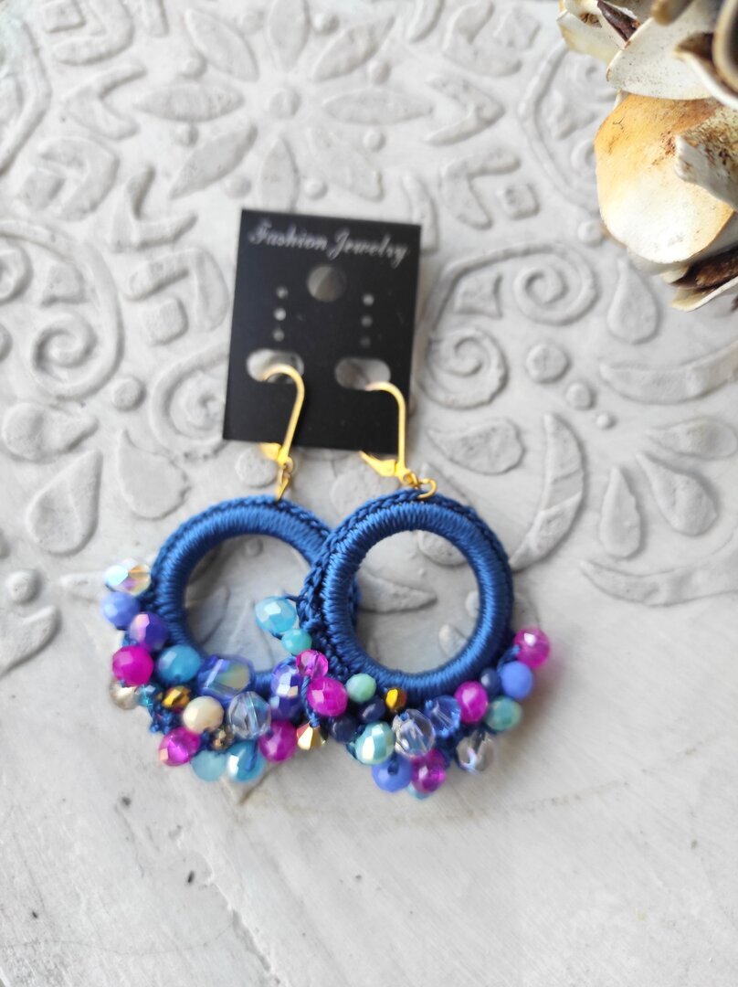 Realizzati con filato metallico dorato e cristalli in tonalità di azzurro/fucsia/bianco, questi orecchini crochet ti faranno brillare in ogni occasione.