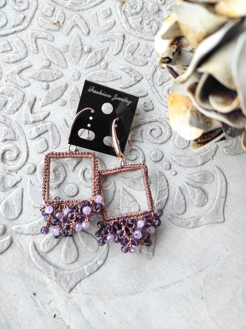Una proposta ultra moderna questi orecchini quadrati con "grappolo" di cristalli viola su filato metallico color rame.