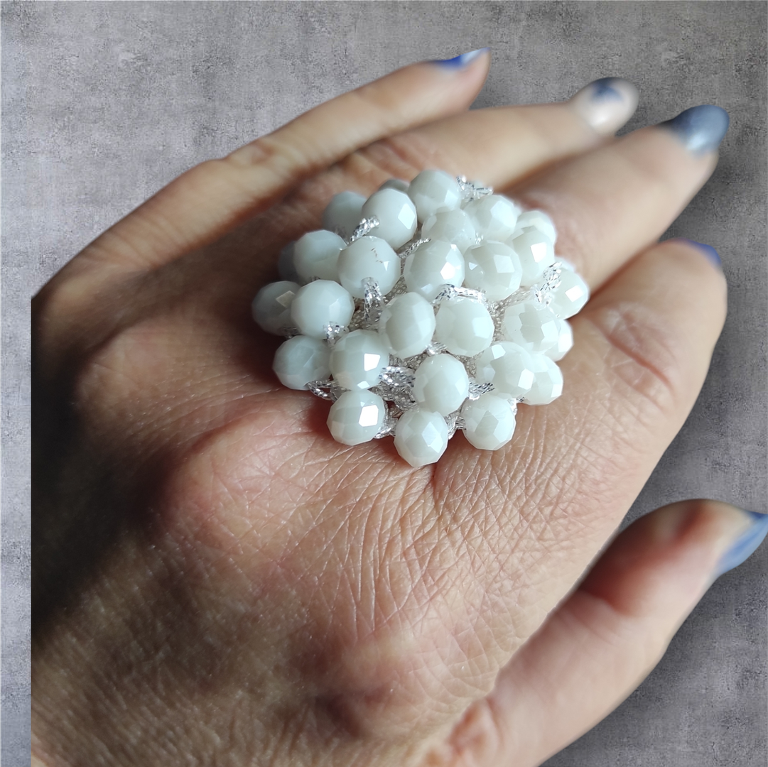 Anello a fascia in filato metallizzato argento, con lavorazione a crochet e cristalli swarosky effetto AB. Luminosissimo!
