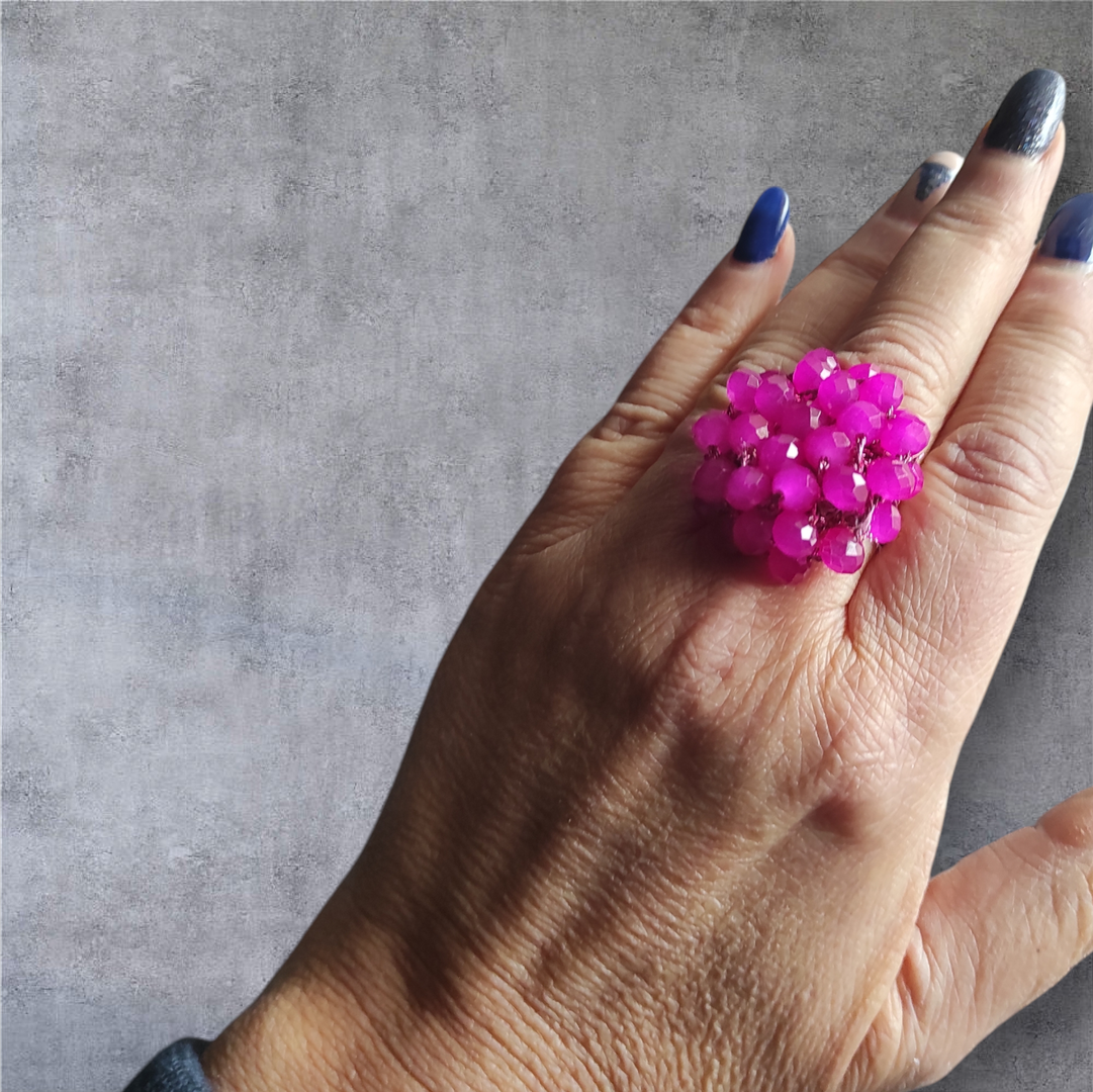 Anello a fascia in filato metallizzato fucsia, con lavorazione a crochet e cristalli di diverse dimensioni e colore per un effetto luminoso e ricco.
