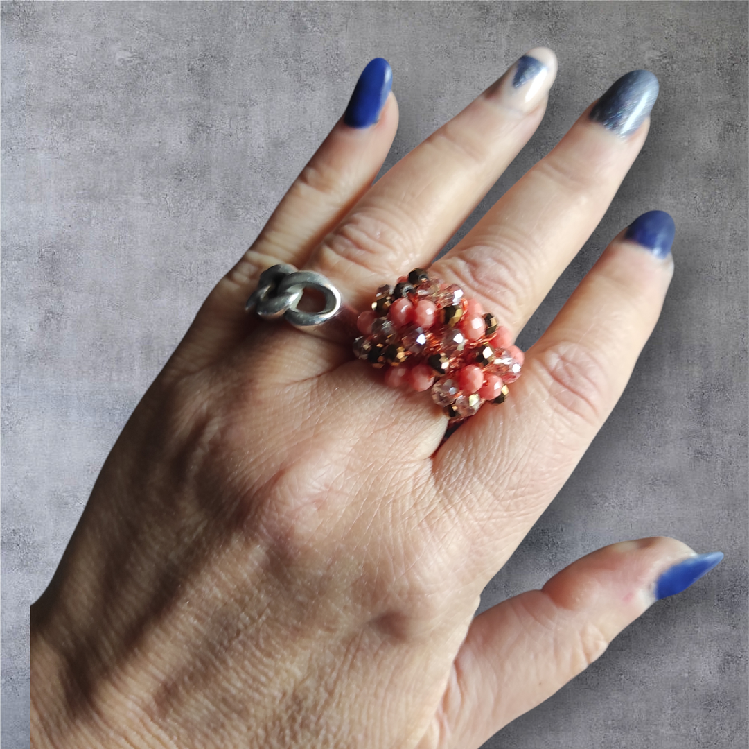 Anello a fascia in filato cotone ritorto tinta corallo, con lavorazione a crochet e mix cristalli bianchi, bronzo e corallo, per un effetto luminoso e ricco.