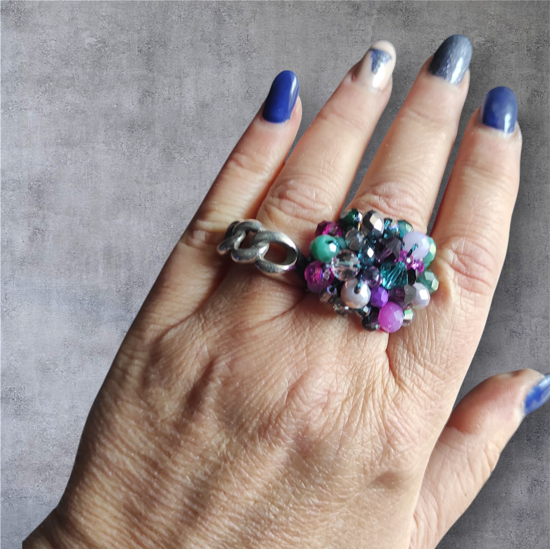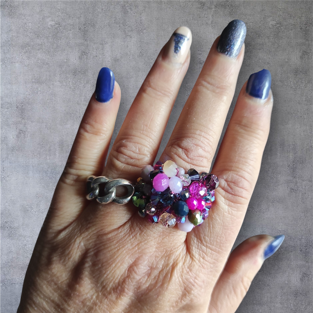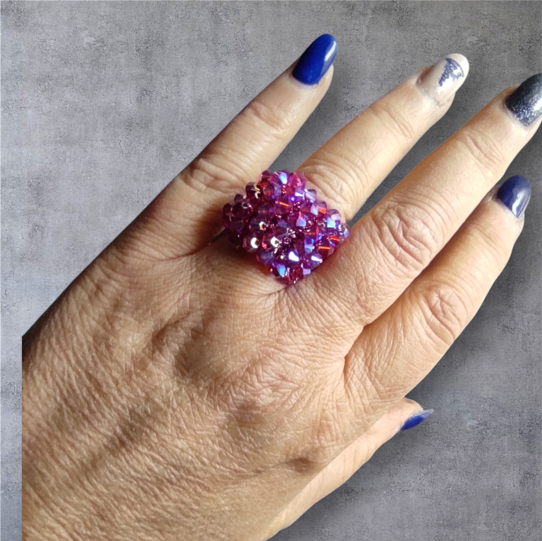 Anello a fascia in filato metallizzato fucsia, con lavorazione a crochet e cristalli swarosky effetto AB. Luminosissimo!