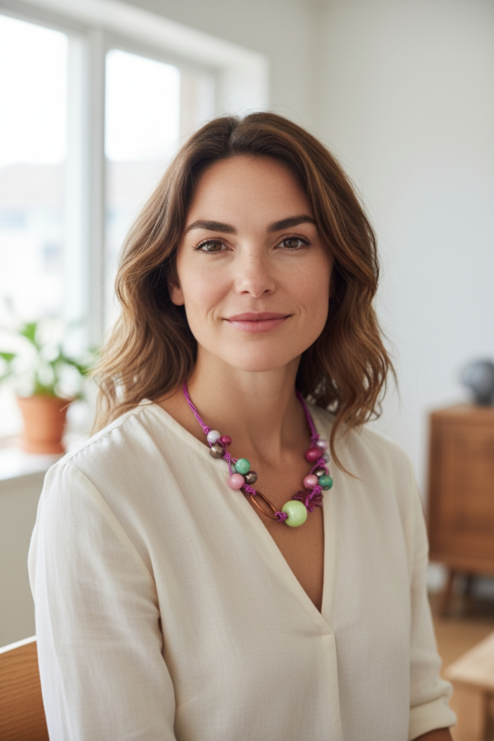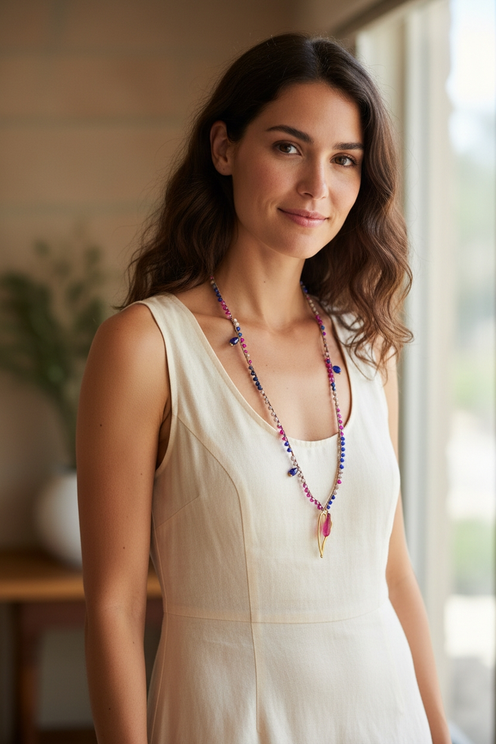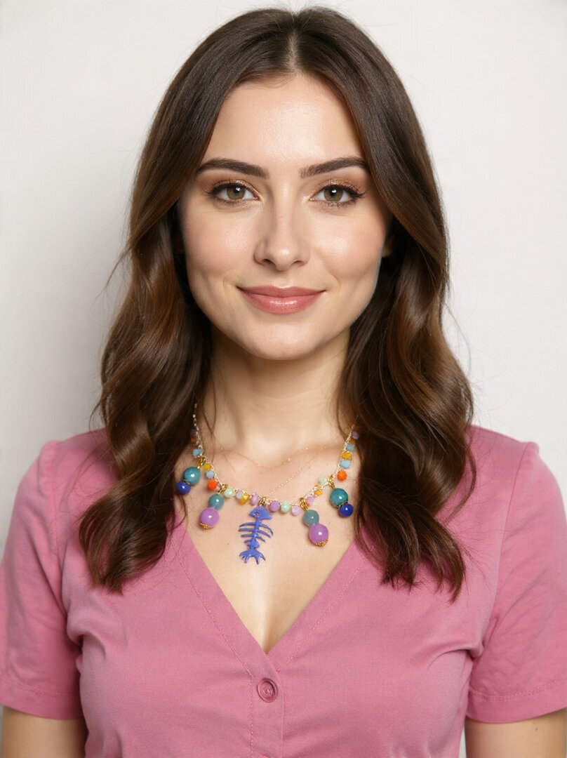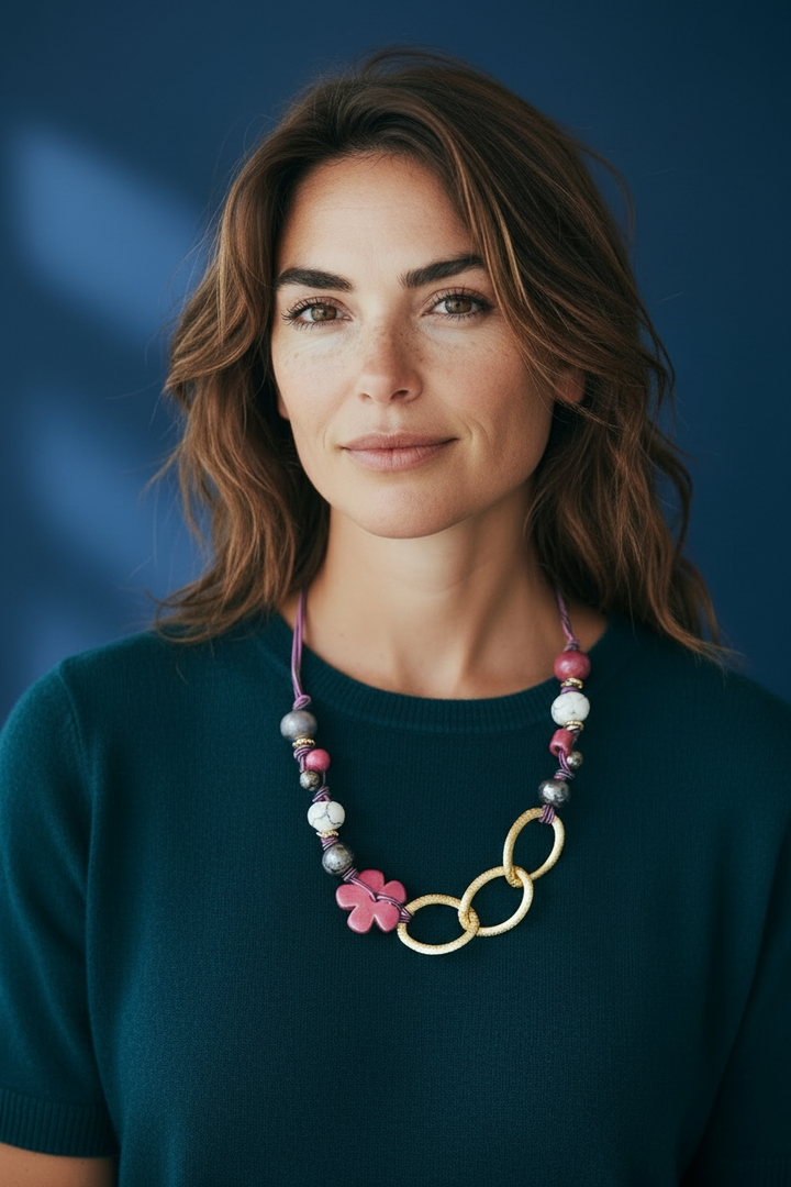 Porta con te un tocco di eleganza con la nostra collana con perle in ceramica azzurro e fucsia.