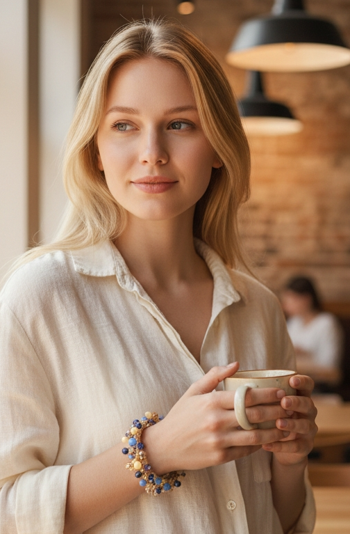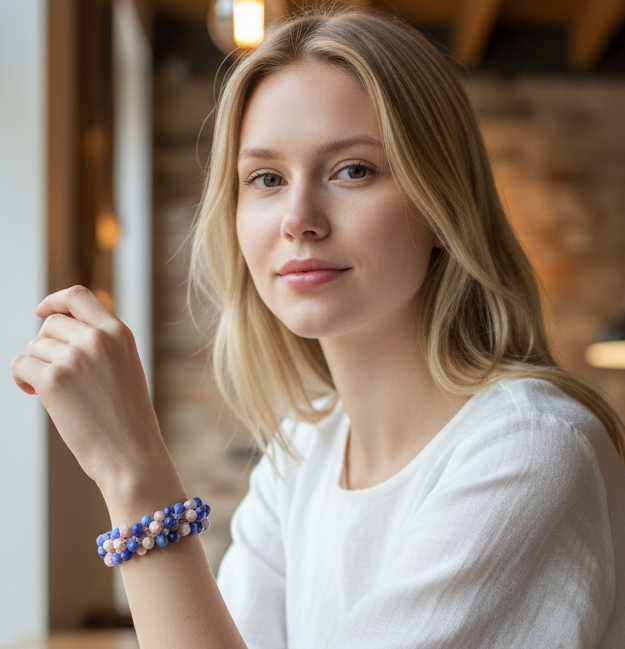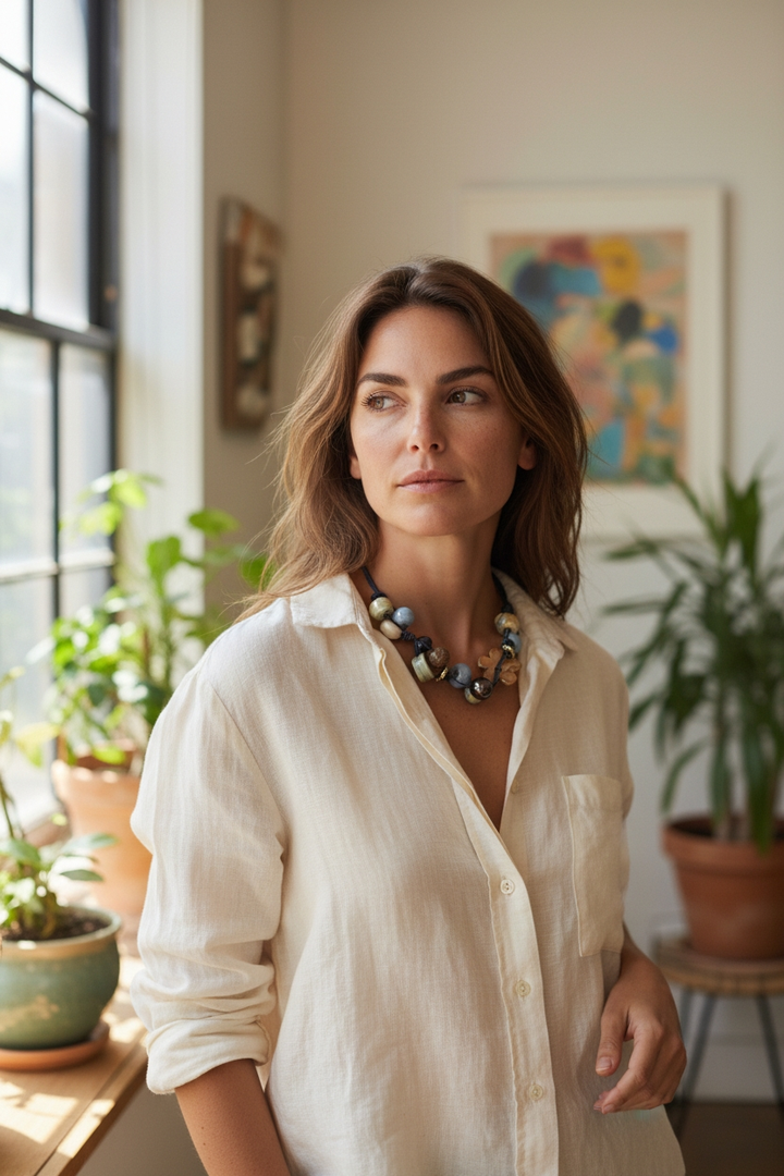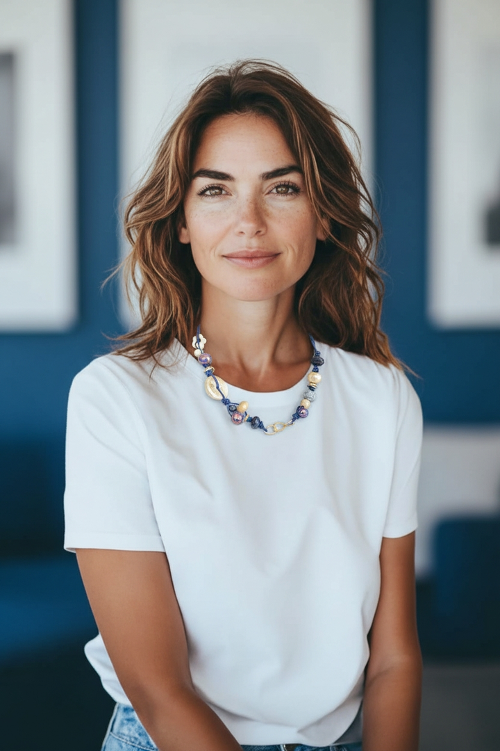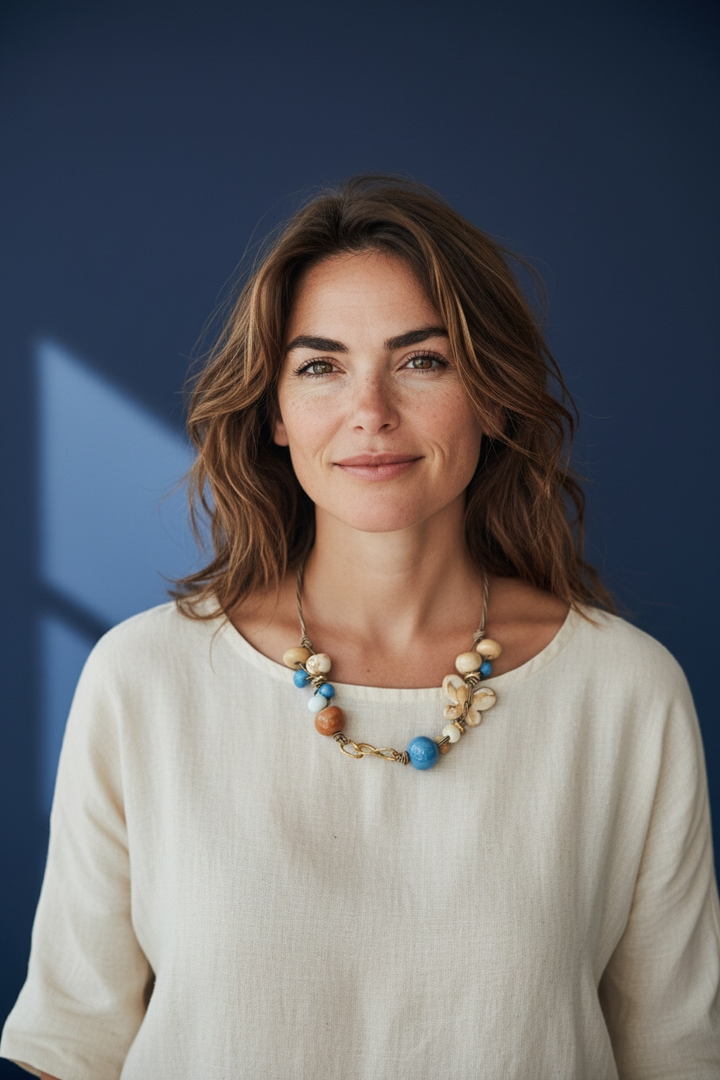 Porta con te un tocco di eleganza con la nostra collana con perle in ceramica panna e blu.