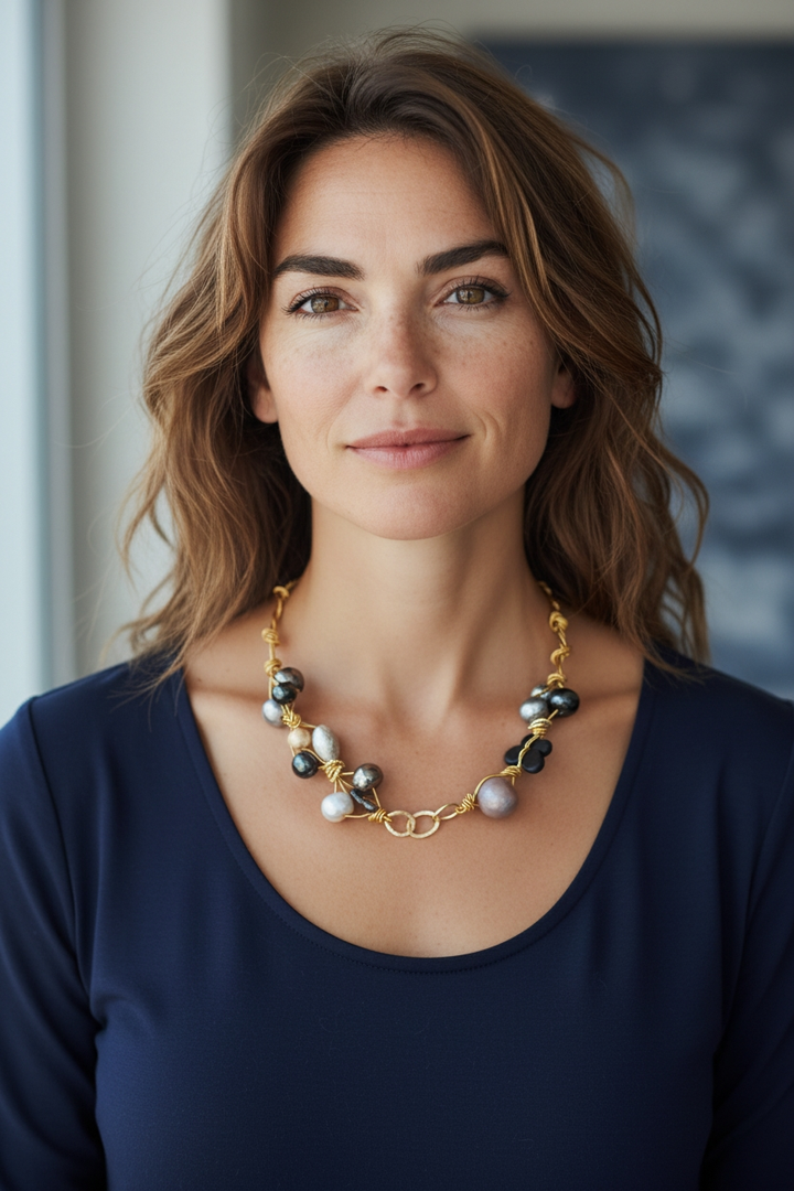Porta con te un tocco di eleganza con la nostra collana con perle in ceramica grigio e nero.