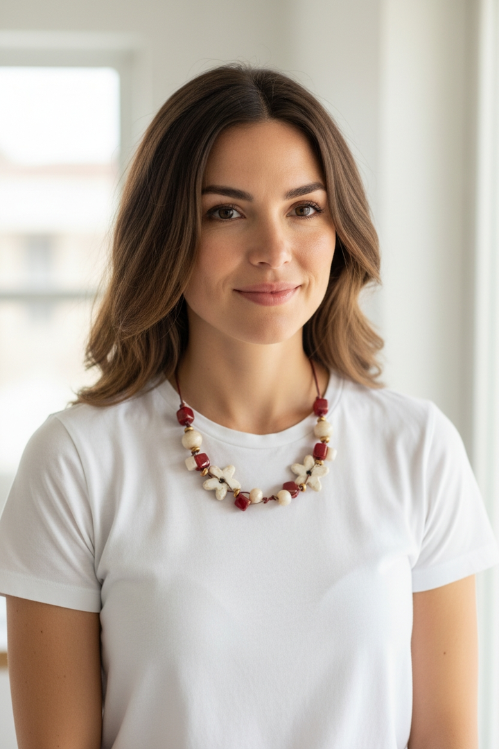 Porta con te un tocco di eleganza con la nostra collana con perle in ceramica panna e rosse.