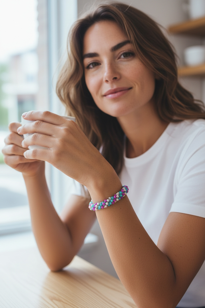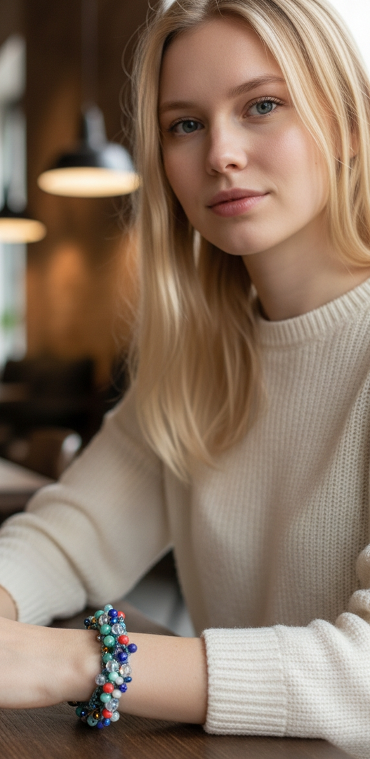 Accendi il tuo look con questo bracciale multifilo reso brillante dai cristalli multicolor e da un bellissimo filato verde metallizzato.