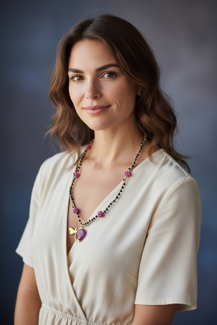 Fiorellini fucsia con centrale in oro, pendente in pietra naturale di agata fucsia e libellula dorata.