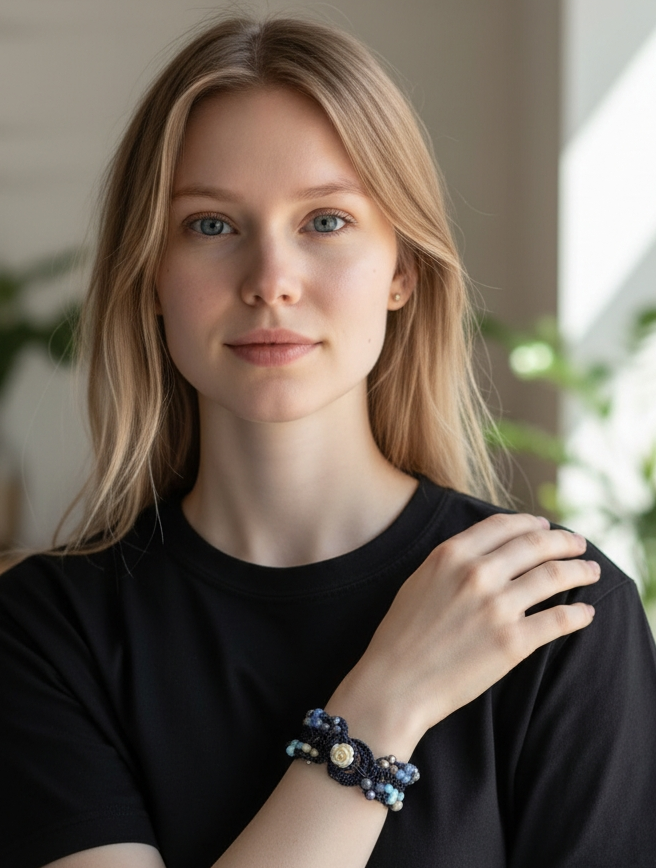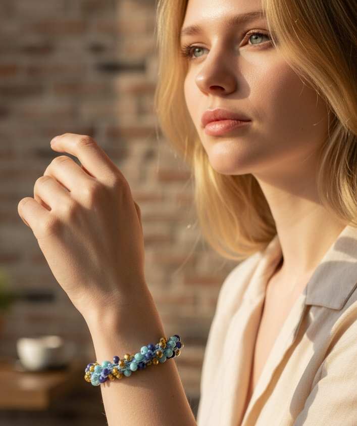 Realizzato con filato metallico rosato e cristalli in panna, bluette e blu, questo bracciale crochet ti farà brillare in ogni occasione.