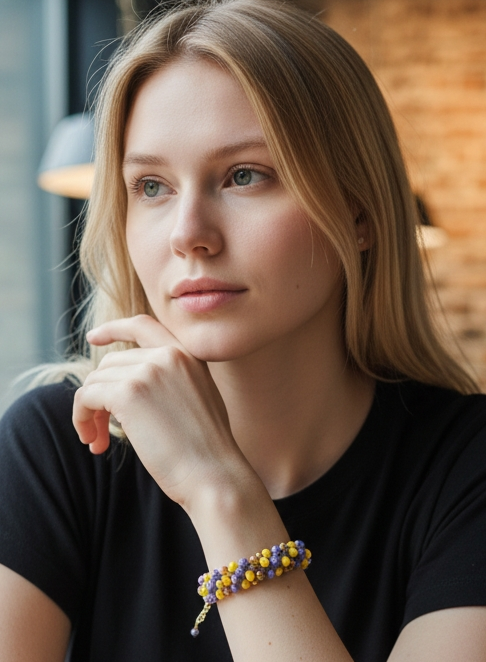 Realizzato con filato metallico dorato e cristalli in tonalità di blu/senape/oro, questo bracciale crochet ti farà brillare in ogni occasione.