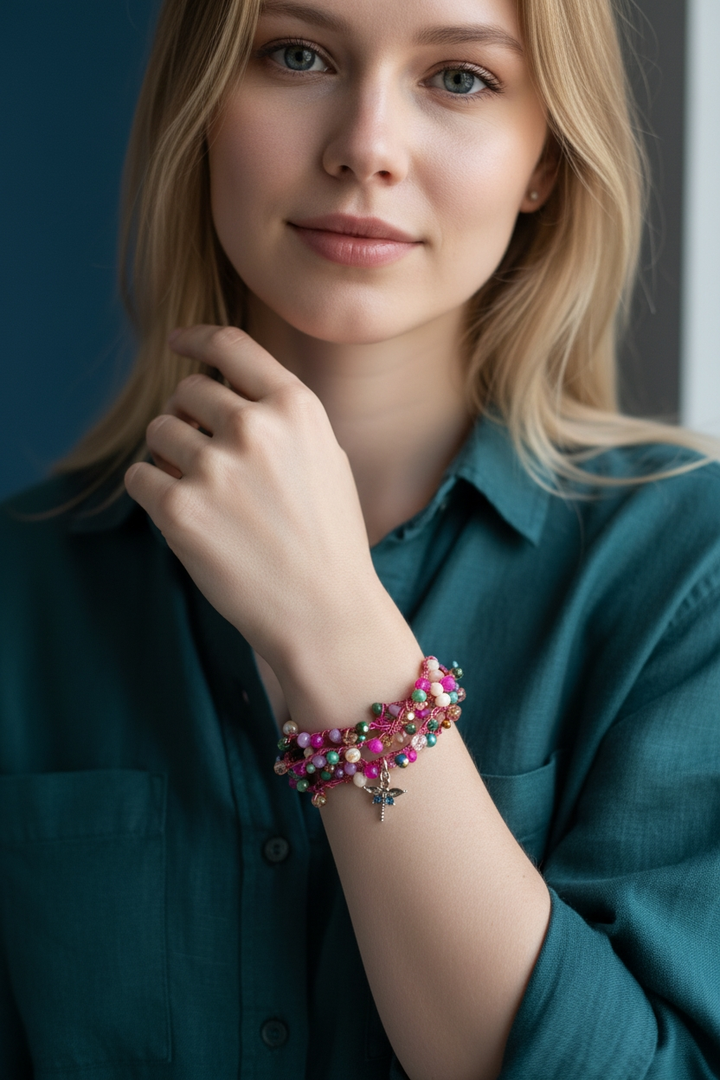 Accendi il tuo look con questo bracciale multifilo reso brillante dai cristalli multicolor e da un bellissimo filato fucsia metallizzato