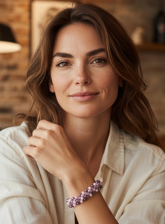 Realizzato con filato metallico rosato e cristalli in rosa, malva e rosa trasparente, questo bracciale crochet ti farà brillare in ogni occasione.