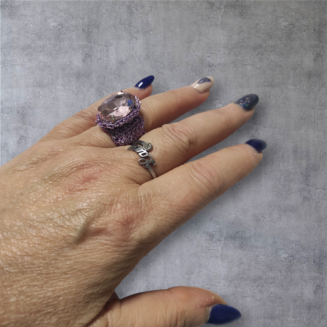 Anello a fascia in filato metallizzato lilla, lavorazione a crochet con cristallo centrale sfaccettato rosa
