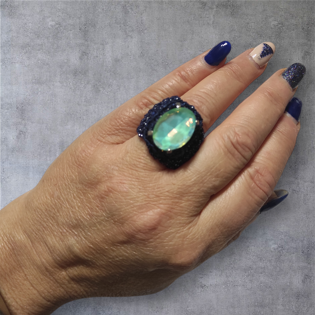 Anello a fascia in filato metallizzato blu, lavorazione a crochet con cristallo centrale sfaccettato verde acqua