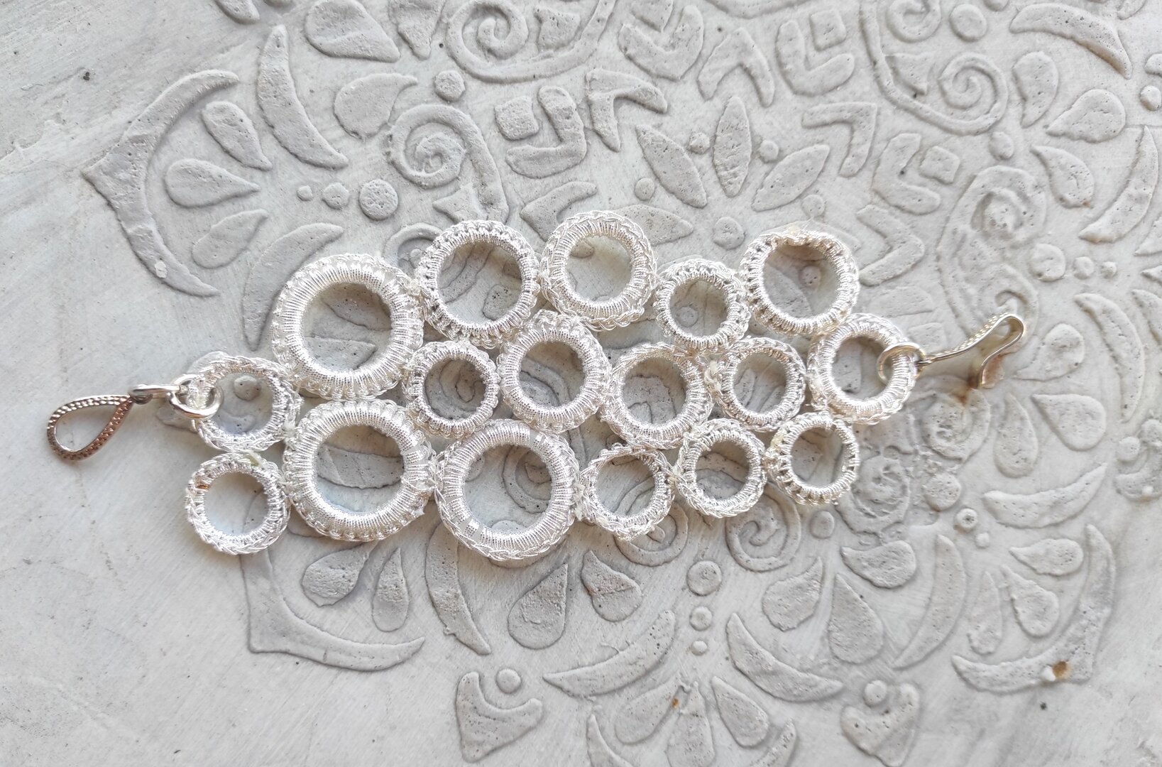 Particolarissimo bracciale a fascia realizzato con cerchi rivestiti di filato metallizzato in cotone, morbido sulla pelle. Alternanza di cerchi e quadrati, per una composizione equilibrata e gradevole.