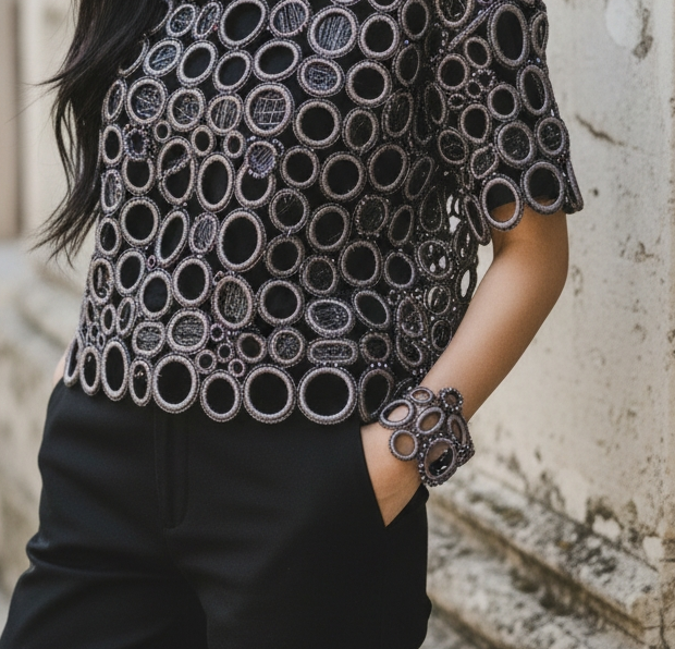 Lavorazione a crochet con filato metallizzato rosso che ingloba cristalli neri iridescenti.