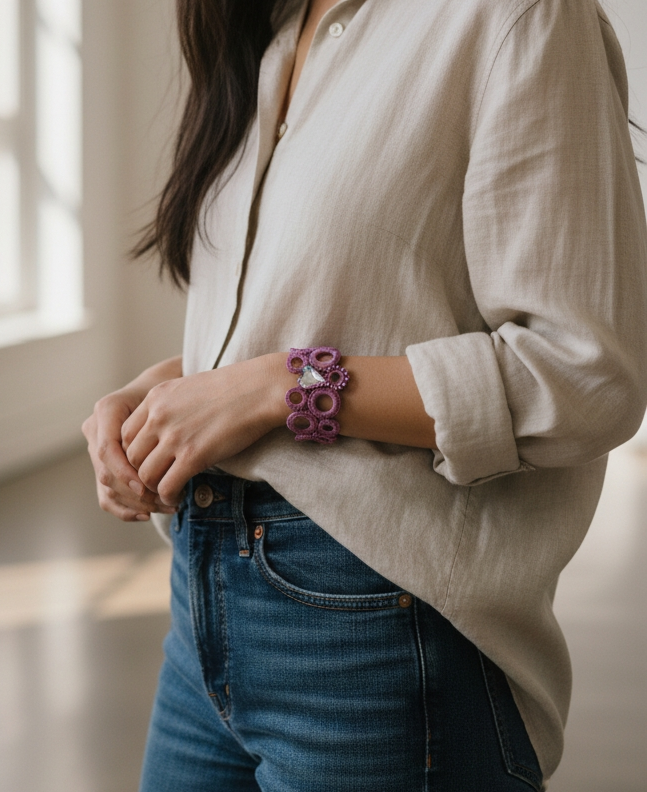 Realizzato con filato metallico dorato e cristalli in tonalità di viola fucsia e panna, questo bracciale crochet ti farà brillare in ogni occasione.